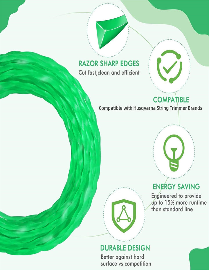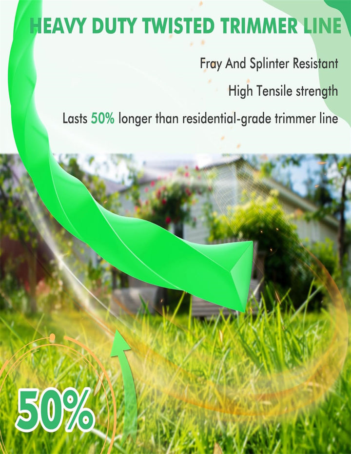 - The patented design on this weed whacker string reduces the noise level by 50%, which gives a better working environment