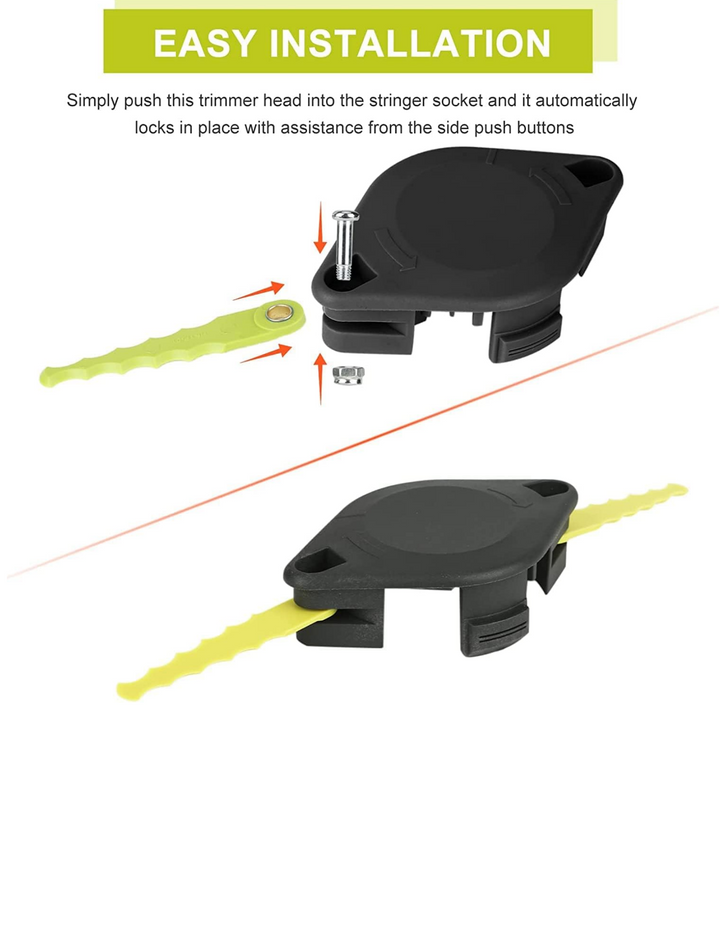 - Easy Installation: simply push this trimmer head into the stringer socket and it automatically locks in place with assistance from the side push buttons, and it does not need adapter.