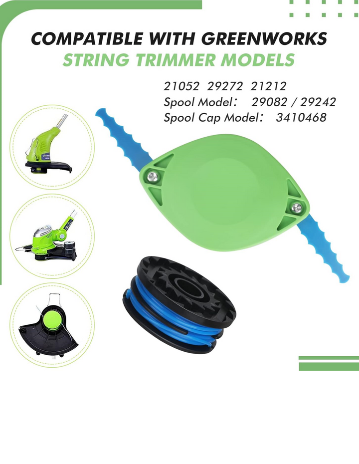 - Compatible with Greenworks string trimmer models 21052 21212 and 21272.Spool Cap model:3411546A6