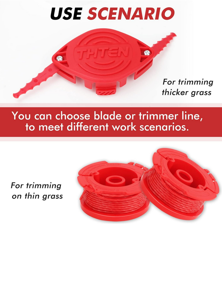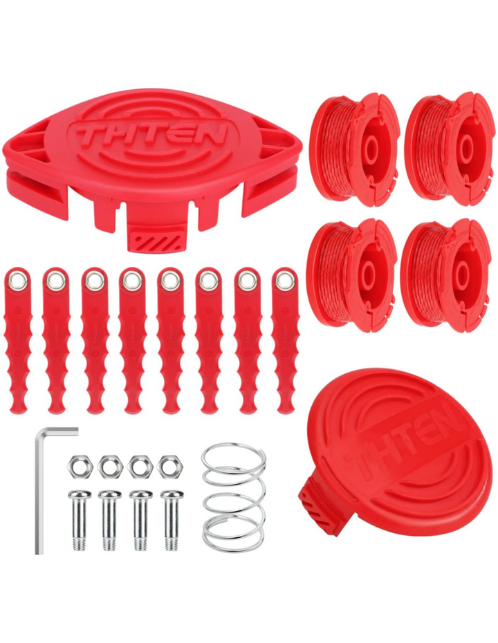 - [Products Include]: The package contains 8 Pack Polycarbonate Blades and 4 Set Screw,4 Pack Trimmer Spool,1 Pack Trimmer Head,1 Pack Spring,1 Pack Trimmer Cap,1 Pack Tool wrench.