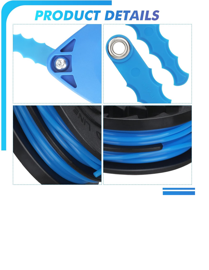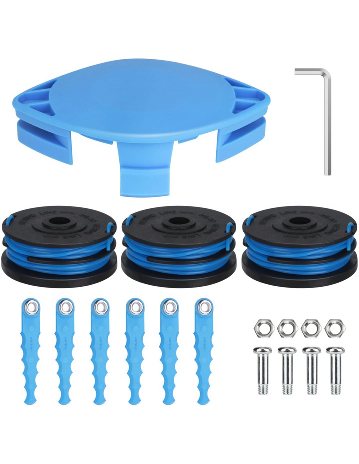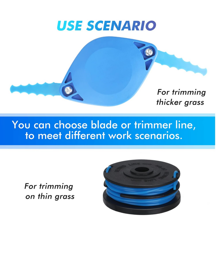 - Products Include: The package contains 6 Pack Polycarbonate Blades and 4 Set Screw, 3 Pack Trimmer Spool, 1 Pack Trimmer Head,1 Pack Tool wrench.