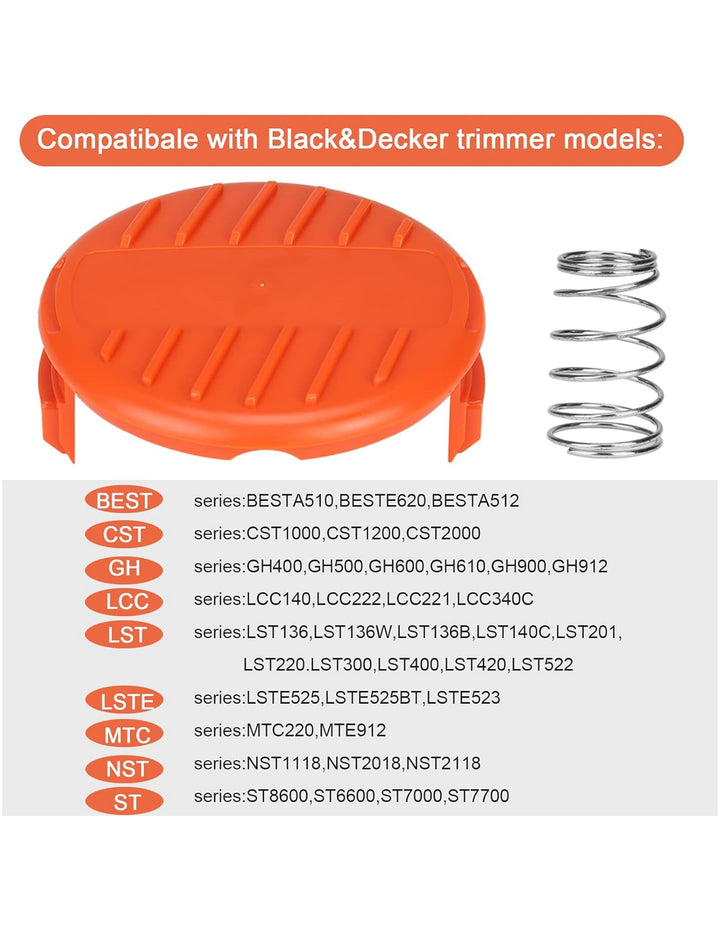 - RC100P Spool Cap Compatible with black and decker trimmers: GH400, GH500, GH600, GH610, GH900, GH912, BESTA510, BESTA512, BEASE620, CST1000, CST1200, CST2000, LST120, LST136, LST140, LST201, LST220, LST300, LST400, LST420, LST522, LST1018, LSTE522, LSTE523, LSTE525, NST1018, NST1024, NST1118, NST1810, NST2018, NST2118, ST7000, ST7200, ST7700, ST7701, ST8600, ST9000.