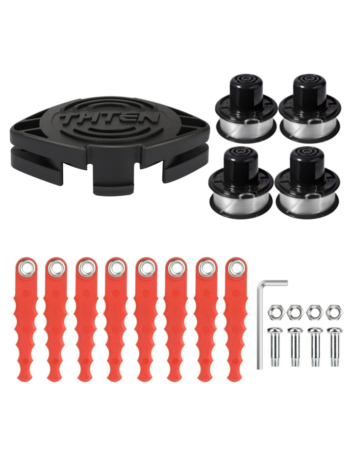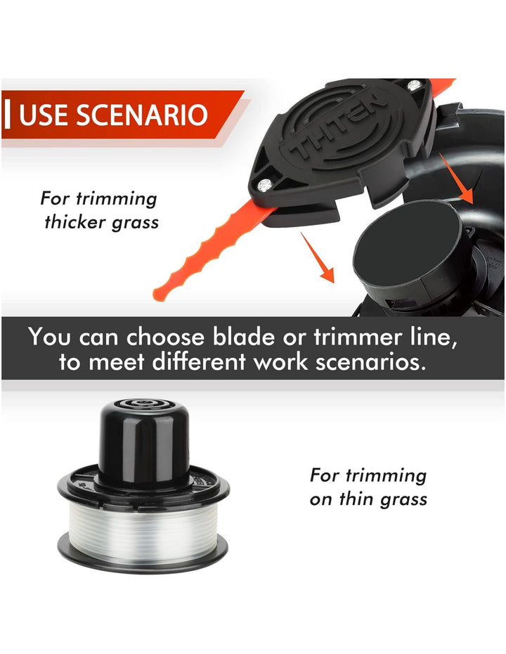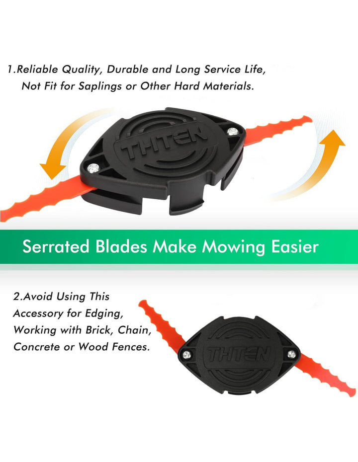 - Products Include: The package contains 8 Pack Polycarbonate Blades and 4 Set Screw,4 Pack Trimmer Spool,1 Pack Trimmer Head,1 Pack Tool wrench.