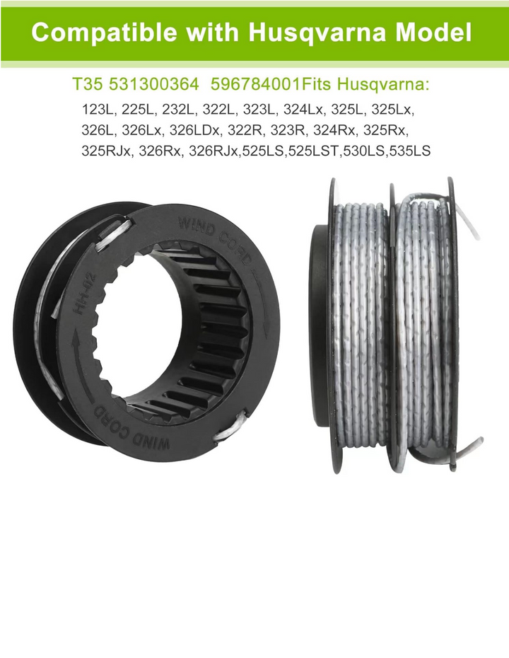- ăCompatible ModelăHusqvarna T35 531300364 596784001 replacement spool, also compatible with Husqvarna trimmer head replacement spools for models 224L 225L 232L 322L 240L 322L 323L 323R 345 FXT, 345 RX trimmers, etc. May fit other models and brands not listed above.