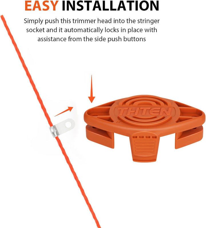 - Easy Installation: simply push this trimmer head into the string socket and it automatically locks in place with assistance from the side push buttons.