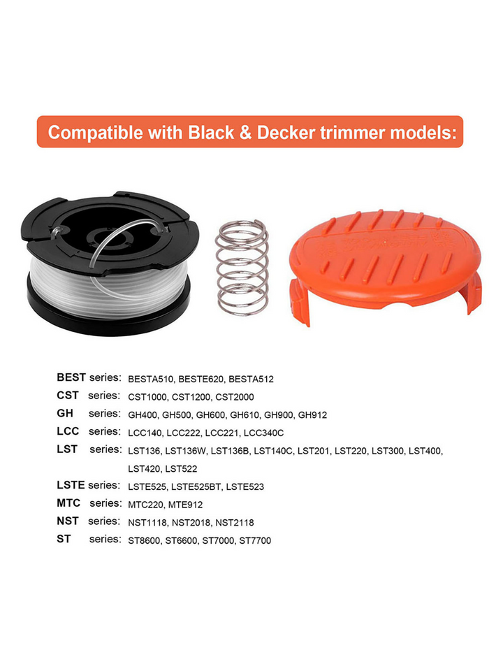 - [Compatible with Black and Decker models]: GH400, GH500, GH600, GH610, GH900, GH912, ST6600, ST7000, ST7700, CST1000, CST1200, CST2000, MTC220, MTE912, NST2018, NST1118, NST2118, LST220, LST300, LST400, LST420, LST136,easy to choose the right spool for your trimmer.